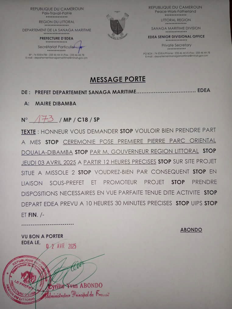 Conformément au message porté du Préfet de la Sanaga Maritime, la cérémonie de pose de la première pierre du Parc Oriental Douala–Dibamba s’est effectivement tenue le jeudi 03 avril 2025 sur le site du projet à Missolé 2, sous la présidence du Gouverneur de la Région du Littoral.