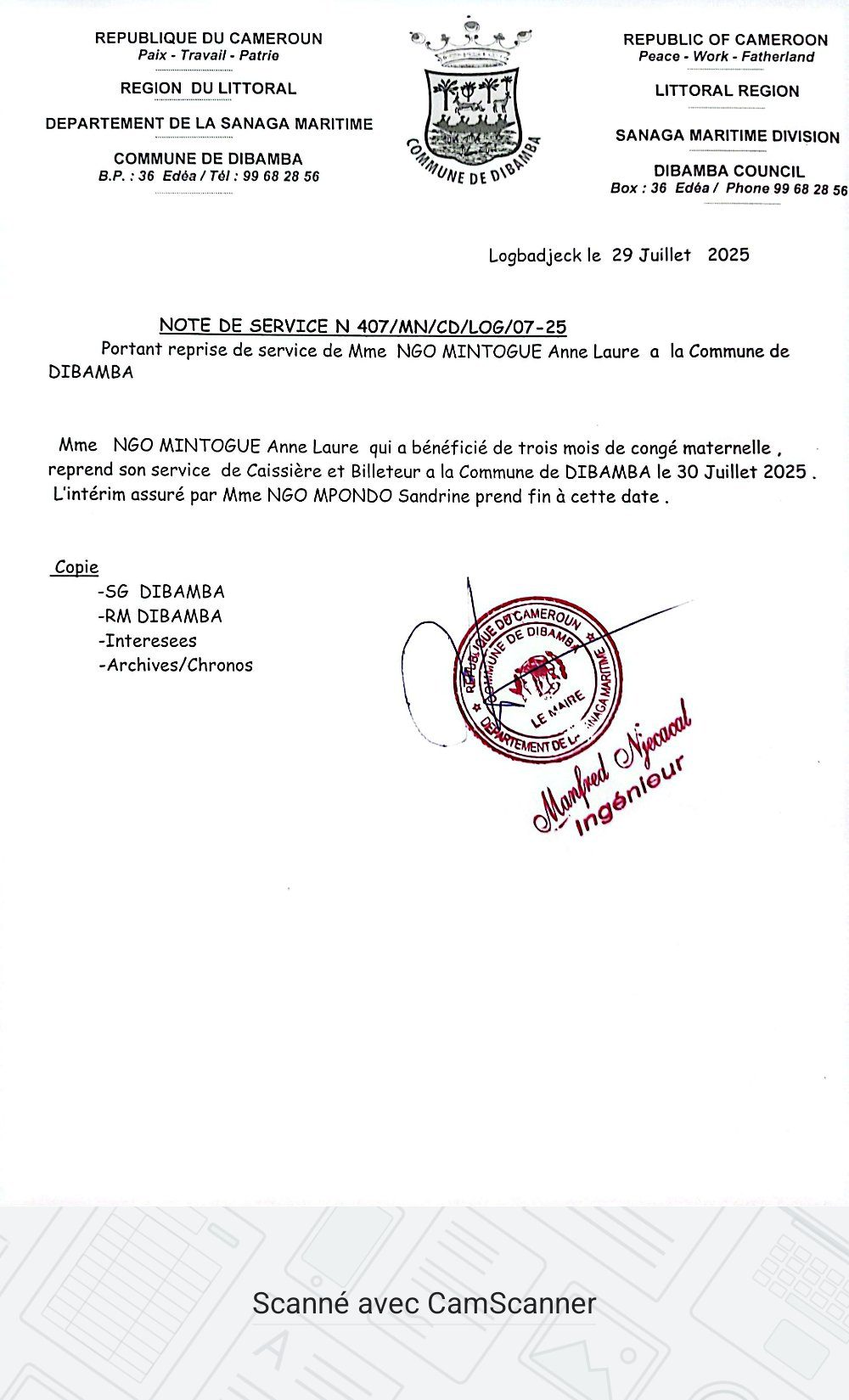 Note de service adressee au Secretaire General et au Receveur Municipal de la Commune de DIBAMBA et a l’interesse Mme NGO MINTOGUE Anne